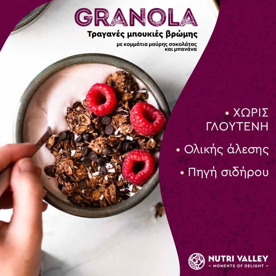 Τραγανές μπουκιές βρώμης με κομμάτια μαύρης σοκολάτας και μπανάνα Συστατικά: Νιφάδες βρώμης ολικής άλεσης 52%, Γλυκαντικό: Μαλτιτόλη, Ηλιέλαιο, Ολιγοφρουκτόζη, Κομμάτια μαύρης σοκολάτας με γλυκαντικό 4% (Κακαόμαζα, Γλυκαντικό: Μαλτιτόλη, Βούτυρο Κακάο, Γαλακτωματοποιητής: Λεκιθίνη Σόγιας, Φυσική αρωματική ύλη βανίλιας, Στερεά κακάο: 60% τουλάχιστον), Απομίμηση σοκολάτας 3%: [γλυκαντικό (μαλτιτόλη), φυτικό λίπος (φοινικέλαιο, φοινικοπυρηνέλαιο, καριτέ), αποβουτυρωμένο κακάο σε σκόνη, γαλακτωματοποιητής (λεκιθίνες)], Αλεύρι ρυζιού, Νιφάδες αποξηραμένης μπανάνας 1%, Αντιοξειδωτικό: εκχύλισμα πλούσιο σε τοκοφερόλες, Γαλακτωματοποιητής: λεκιθίνη ηλίανθου, Αρωματικές ύλες, Αλάτι.